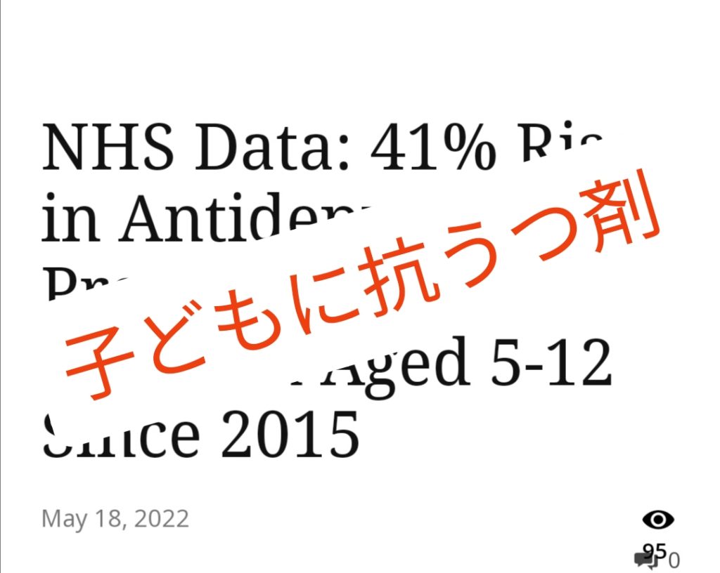イングランドでは、5~12歳に対する抗うつ薬の処方が、2015年から比べ、41%増えたそうです。