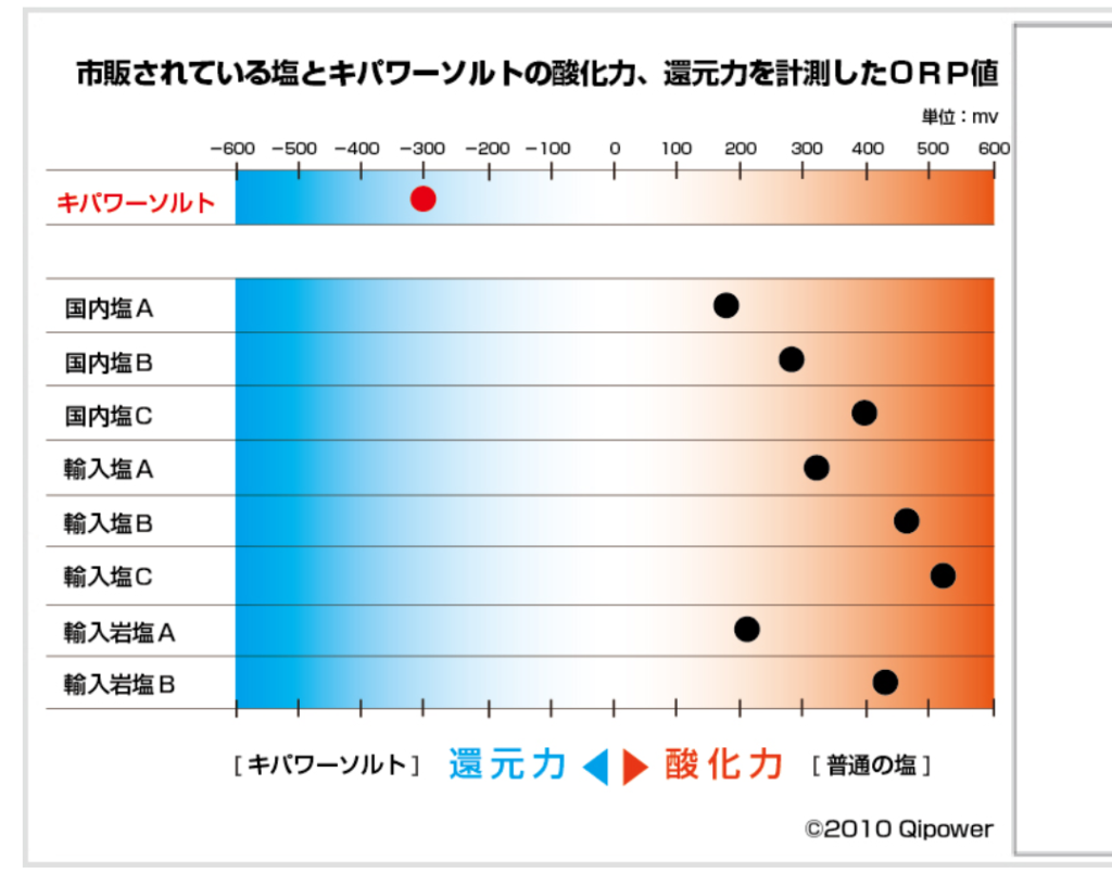 還元力はテスターで測定可能で、公式HPにある↑の結果の通り、キパワーソルトは高い還元力を持っているのです。