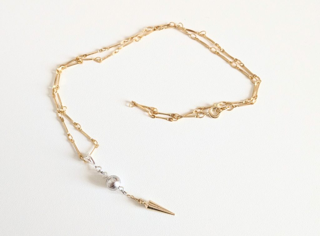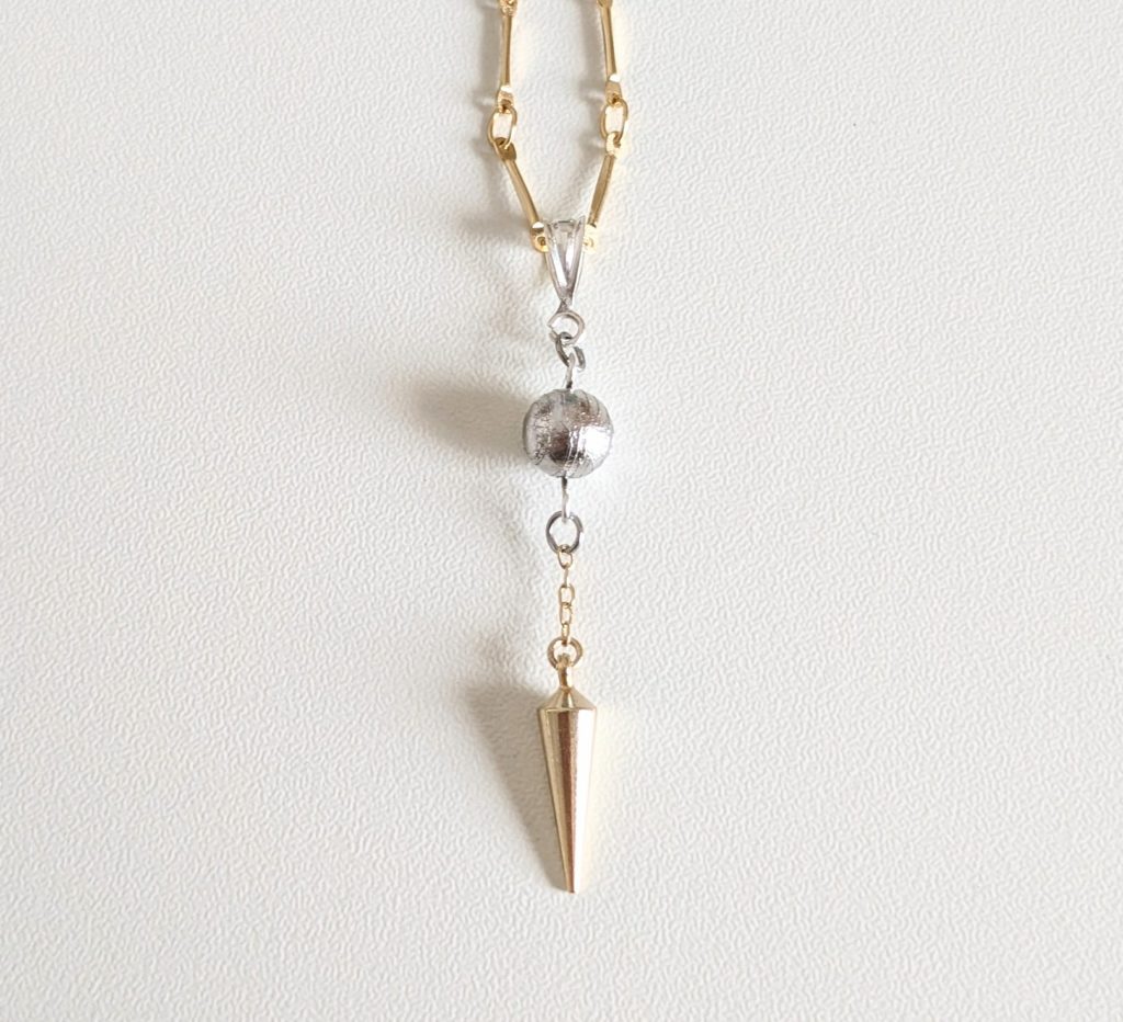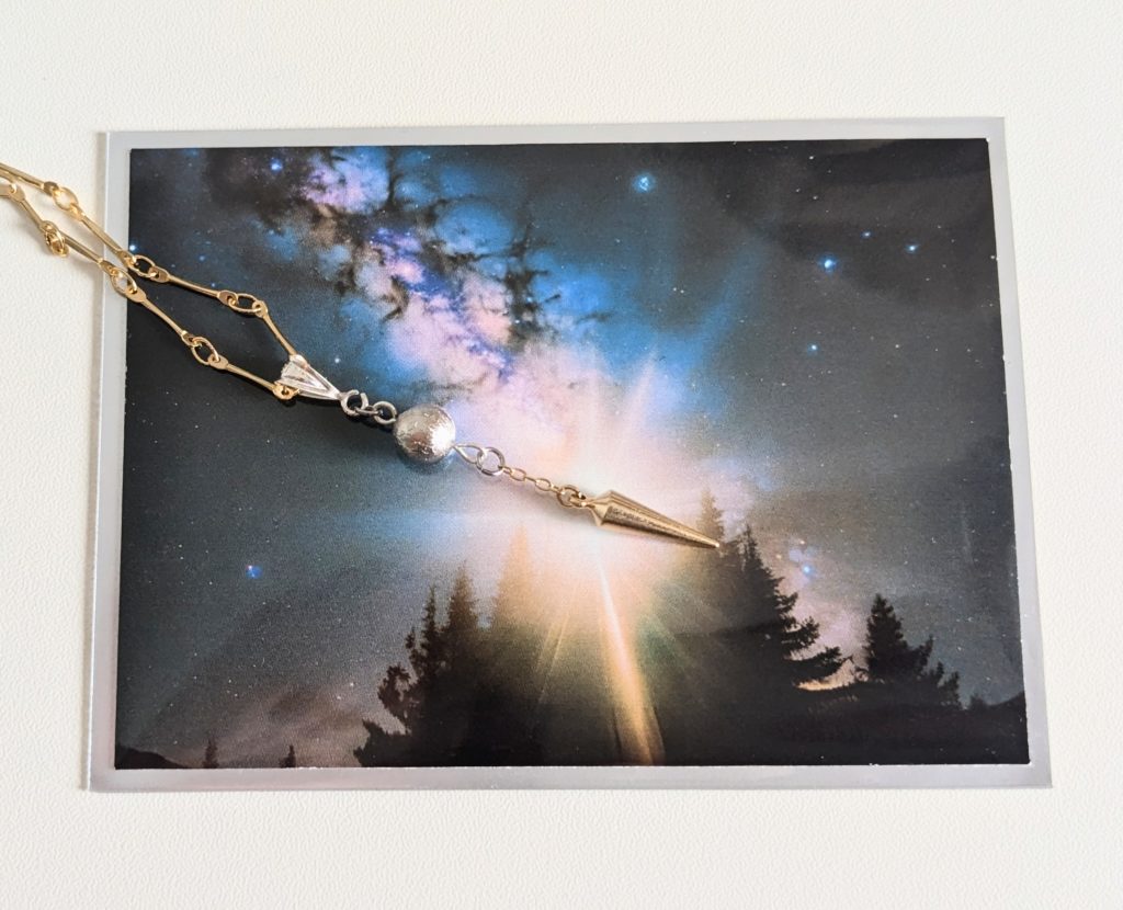 第一弾として作ったのがこの『メテオライト(隕石)✖️真鍮ペンデュラム スターシード・ネックレス』です。